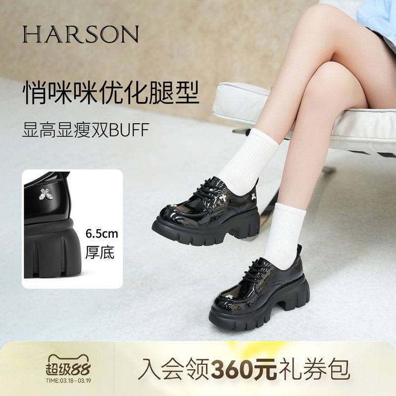 哈森/HARSON【爵士乐福鞋】春新款绑带厚底增高蝴蝶黑色皮鞋